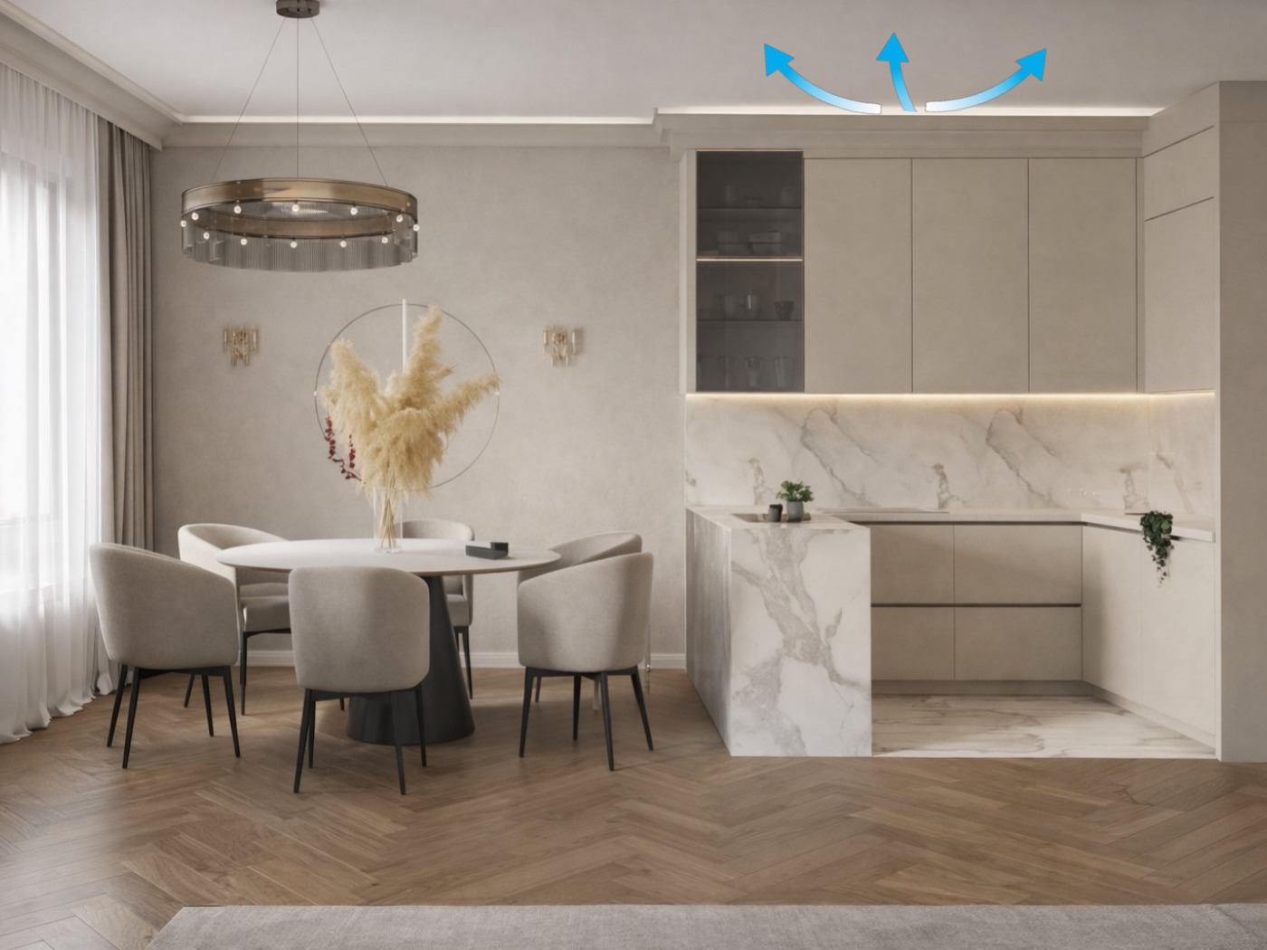 Что было сделано: Решётки убрали в щели. Создали эффект "парящего потолка". Адаптер подвели вплотную к натяжному потолку, узкую щель закрыли молдингом. Добавили подсветку - визуально остаётся только световая линия. Основной опуск потолка составил 80 мм. Использовали плоские воздуховоды 60 мм, чтобы сохранить максимум пространства.